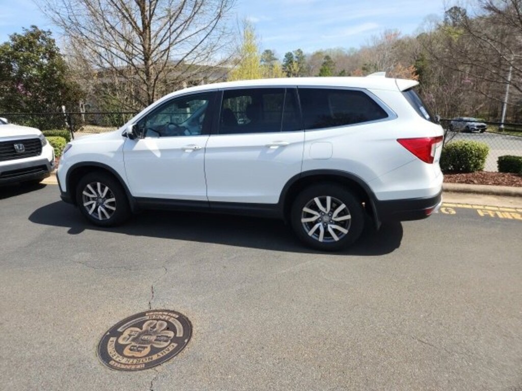 Clean CARFAX. CARFAX One-Owner. Platinum White Pearl 2022 Honda Pilot EX-L FWD 9-Speed Automatic 3.5L V6 24V SOHC i-VTEC 3rd row seats: split-bench, 4-Wheel Disc Brakes, 7 Speakers, A/V remote: CabinControl, ABS brakes, Air Conditioning, AM/FM radio: SiriusXM, Apple CarPlay/Android Auto, Auto High-beam Headlights, Auto-dimming Rear-View mirror, Automatic temperature control, Blind Spot Information (BSI) System warning, Brake assist, Delay-off headlights, Electronic Stability Control, Exterior Parking Camera Rear, Forward collision: Collision Mitigation Braking System (CMBS) + FCW mitigation, Front dual zone A/C, Fully automatic headlights, Garage door transmitter: HomeLink, Heated door mirrors, Heated Front Bucket Seats, Heated front seats, Lane departure: Lane Keeping Assist System (LKAS) active, Low tire pressure warning, Memory seat, Occupant sensing airbag, Outside temperature display, Overhead airbag, Panic alarm, Power driver seat, Power Liftgate, Power moonroof, Power steering, Rear seat center armrest, Remote keyless entry, Steering wheel mounted audio controls.