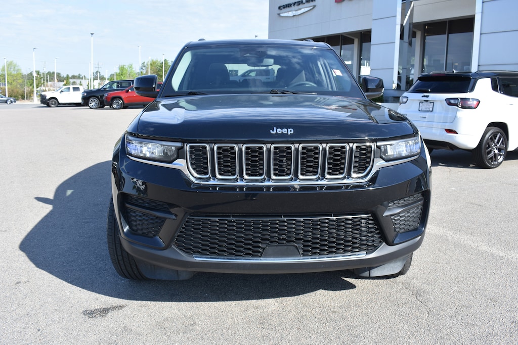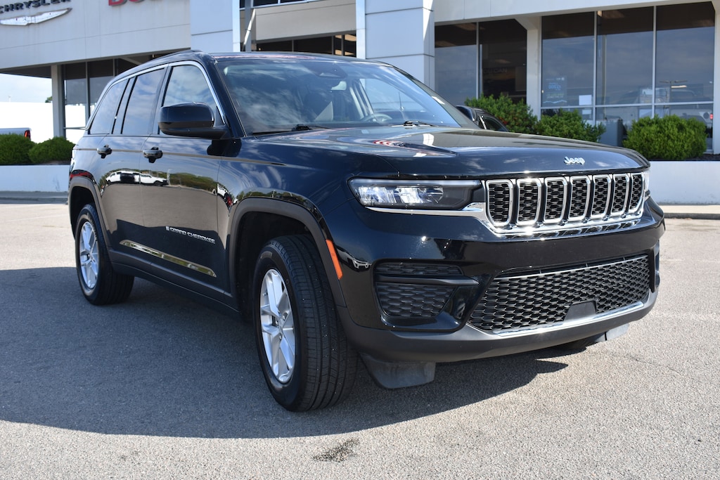 CARFAX One-Owner. Diamond Black Crystal Pearlcoat 2023 Jeep Grand Cherokee Laredo RWD 8-Speed Automatic 3.6L V6 24V VVT 3.45 Rear Axle Ratio, 4-Wheel Disc Brakes, 6 Speakers, ABS brakes, Air Conditioning, Alloy wheels, Anti-whiplash front head restraints, Automatic temperature control, Brake assist, Bumpers: body-color, Cloth Seats, Compass, Delay-off headlights, Dual front impact airbags, Dual front side impact airbags, Electronic Stability Control, Emergency communication system, Four wheel independent suspension, Front anti-roll bar, Front Center Armrest w/Storage, Front dual zone A/C, Fully automatic headlights, Heated door mirrors, Illuminated entry, Knee airbag, Laredo X, Low tire pressure warning, Molded In Color Black/Gloss Black Roof Rails, Normal Duty Suspension, Occupant sensing airbag, Outside temperature display, Overhead airbag, Panic alarm, ParkView Rear Back-Up Camera, Power door mirrors, Power driver seat, Power steering, Power Sunroof, Power Sunroof (DISC), Power windows, Quick Order Package 23D Laredo X, Radio data system, Radio: Uconnect 5 w/8.4" Display, Rear anti-roll bar, Rear window defroster, Rear window wiper, Remote keyless entry, Security system, Speed control, Speed-Sensitive Wipers, Spoiler, Steering wheel mounted audio controls, Tachometer, Telescoping steering wheel, Tilt steering wheel, Traction control, Trip computer, Variably intermittent wipers, Voltmeter, Wheels: 18" x 8" Fully Painted Aluminum.
