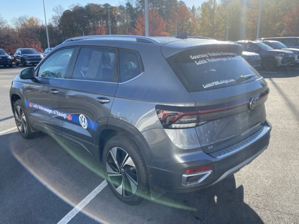 Certified. Platinum Gray Metallic 2025 Volkswagen Taos 1.5T SE AWD 8-Speed Automatic with Tiptronic 1.5L I4 Turbocharged DOHC 16V LEV3-SULEV30 174hp Local Trade, Non-Smoker, Serviced Here, Purchased Here, Certified Warranty - 2 Years / 24,000 Miles, AM/FM radio: SiriusXM with 360L, Automatic temperature control, Brake assist, CloudTex & Cloth Seating Surfaces, Electronic Stability Control, Emergency communication system: VW Car-Net Safe & Secure 5-year, Exterior Parking Camera Rear, Four wheel independent suspension, Front dual zone A/C, Heated Front Bucket Seats, Panoramic Sunroof Package, Power driver seat, Radio: MIB3 Composition Media AM/FM/HD, Rain sensing wipers, Rear window wiper, Remote keyless entry, Rubber Mats Kit, Speed-sensing steering, Split folding rear seat, Steering wheel mounted audio controls, Traction control, VW Care, Wheels: 18" 2-Tone Machined Alloy.